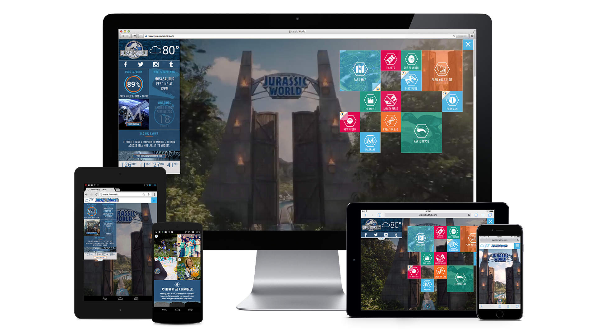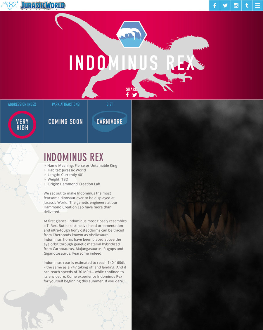 JurassicWorld.com brings the theme park to life as an immersive, responsive in-world website, treating the island as if it's absolutely real. Fans new and old can experience the greatest theme park on Earth without risk of being eaten. Filled with thoughtful details, the site builds anticipation by showcasing everything the real Jurassic World would offer: hotels, attractions, time-reactive announcements, video feeds, and of course, dinosaurs. At the center of it all, an interactive map encourages users to explore Isla Nublar, location by location. Our site created a ton of buzz all across the globe. The site made it on the front page of Reddit. It was also featured in Web Designer magazine and the Visually and Verbally podcast, to name a few. A popular YouTube channel even analyzed the site.